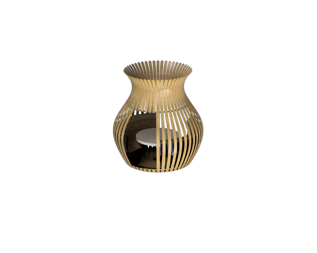 This coworking meeting table, inspired by a flower bulb, is crafted from steam-formed plywood. Its unique design offers both aesthetic appeal and functional workspace, encouraging collaboration in a visually engaging environment. The table’s organic shape fosters a creative and inclusive atmosphere for meetings and team activities.